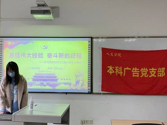 为深入学习贯彻十九届六中全会精神,进一步培养学生党员的大局意识与担当意识,2021112516时,本科广告党支部组织党员同志通过线下开展学习活动的方式对十九届六中全会的内容及精神进行了深入学习。本次活动由谭馨悦同志主持,支部全体成员参加。