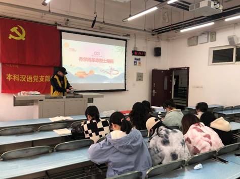 接下来是第二项学习,家乡红色基地打卡汇报,本次打卡汇报由第五小组负责。蔡依琳同志首先介绍了古田会议旧址,回顾了古田会议的革命历史,此外还介绍了古田会议的建筑格局和遗存文物,最后总结出古田会议将理论与实践相结合的革命意义,展现了革命先辈的智慧和精神。接着刘烁同志介绍了铁人王进喜纪念馆,向大家讲述了在大庆油田开发时期,王进喜不顾自身伤病毅然跃入油田,用身体搅拌泥浆的故事,最终为后世流传下了艰苦创业、甘于奉献的大庆精神以及为国分忧、忘我拼搏的铁人精神。最后额仁生·恩和巴图同志介绍了乔尔玛革命烈士陵园,这是一座为纪念修建天山独库公路而牺牲的168名革命烈士而建成的国家革命烈士陵园,纪念碑上写着“为独库公路献出生命的同志永垂不朽”,他们用生命铸成的公路造福民生,他们的精神也同样代代相传,浩气长存。
