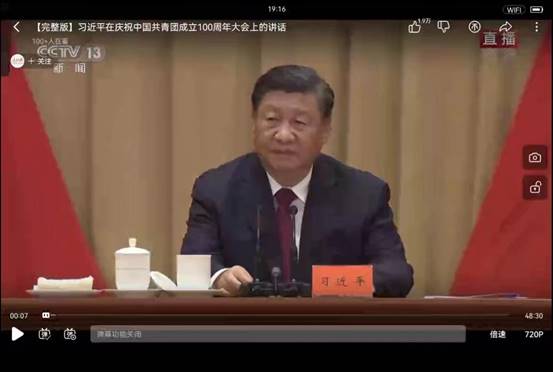 随后,李薇同志组织同学们一同观看习近平总书记在庆祝中国共青团成立100周年大会上的讲话视频。