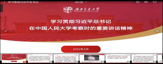 本次会议全面学习了习近平总书记在中国人民大学考察时的重要讲话精神以及学习了习近平总书记在庆祝中国共青团成立100周年大会上的重要讲话精神。此次学习使支部成员们受益匪浅,领学人李薇同志说道:我们在研究生期间,应积极进取、刻苦学习,不辜负党和国家对我们的期望,以高标准严格要求自己,争取在青春的赛道上奋力奔跑,跑出当代青年的最好成绩!