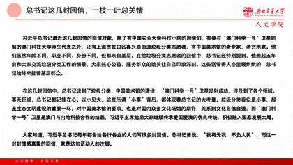 最后,周燕琳同志强调,近期的回信体现了习近平总书记对基层群众始终如一的牵挂。习近平总书记谈到的垃圾分类、中国美术馆的建设、“澳门科学一号”卫星发射成功,涉及到了各个领域。事无巨细,习近平总书记都记挂在心。习近平总书记曾说,“我将无我,不负人民”,而这一封封情感真挚的回信,就是这句话动人的注脚。