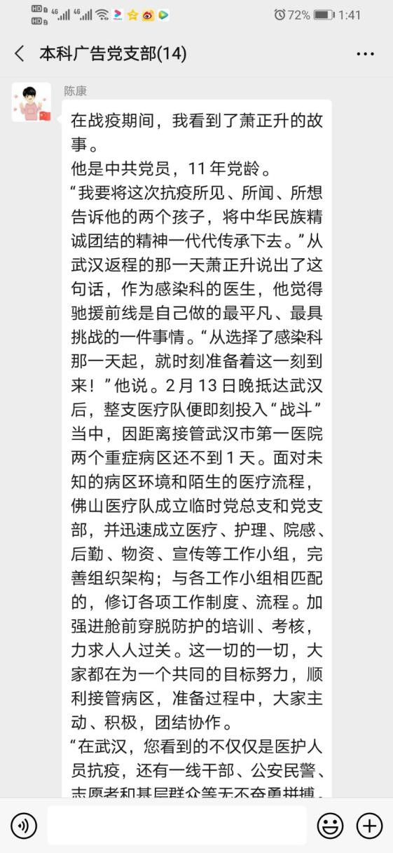 随后,支部成员们互相交流,依次讲述了自己看到的或者亲身经历的战疫故事。池茜同学分享了护送金银潭医院抗疫一线医护人员的武汉快递小哥汪勇的故事,她认为我们要见贤思齐,学习汪勇同志爱岗履责、恪尽职守的敬业精神,协作互助、投身实践的志愿精神,开拓创新、担当有为的时代精神,友善无私、助人为乐的奉献精神,疫情防控斗争贡献自己的力量。紧接着,张宇同学与大家交流了73岁高龄的李兰娟院士高龄出征武汉、不顾自身安危只想救人的赵童医生还有在防控一线因过度劳累而猝死的宋英杰同志等等一个个感人的光辉事迹,她谈到,作为一名预备党员,我们应当向他们看齐,学习他们对初心的坚守,一是要学习他们坚守信念、对党忠诚的政治本色,二是要学习他们敢于担当、恪尽职守的昂扬斗志,三是要学习他们舍身忘我、一心为民的高尚情怀。最后,支部书记李盛兰同志分享了90后女孩甘如意被称为“最美逆行者”的故事,同时联系到自己生活中为抗疫做出贡献的警察、外卖员、志愿者、建筑工人这些无名英雄,让我们看到了疫情当前,每个平凡人都在贡献着自己不平凡的力量。她认为这是舍小我伟大我的精神品质,是中华民族仁爱、善良、付出、舍己为人、义大于利的伟大精神,也是每一个普通人一方有难八方支援的精神。