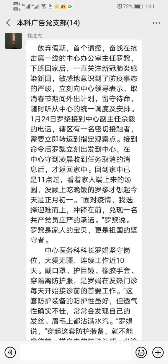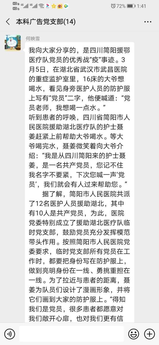 2020年4月16日晚上20:00,德赢vwinac米兰合作伙伴本科广告党支部在线上开展“学习榜样守初心,主动作为担使命”专题党日活动。活动主要内容为疫情期间,我们发现身边抗疫的榜样人物和先进事迹,学习交流他们身上的担当与光辉,激励自己履行责任与使命。本次活动由支部副书记徐丹同志主持。
