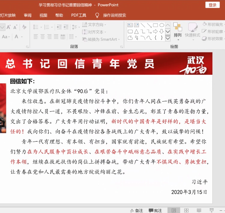 重点学习了《习近平给北京大学援鄂医疗队全体“90后”党员的回信》的内容和相关资料。通过学习,同志们一致认为扬帆筑梦亦无悔,青春建功正当时。“90后”党员要永葆初心、坚定信心、下定决心,以更昂扬的姿态、更饱满的热情、更坚定的意志,在平凡的岗位上绽放最美的芳华,用青春奋斗书写当代青年党员的奋斗和担当!