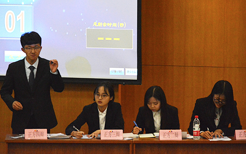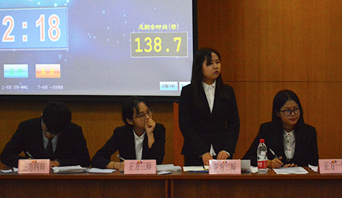 比赛正式开始前,正反双方进行了简短的自我介绍。德赢vwinac米兰合作伙伴代表队由杨咏薇、严雪娇、谢汶甜以及徐舟雨等5位同学组成。比赛首先进入立论环节。持“法律有情”观点的正方德赢vwinac米兰合作伙伴队率先立论。正方一辩杨咏薇从法律的定义入手,谈论它是否表达出一种情感,她从“法律条文体现以人为本的原则”、“从法律的意义来看,保护、惩罚、价值倡导也体现了情”和“从法律的内涵来看,法律从始至终体现着情,法律是对无数个情境中的高度理性的整合”三个方面以具体的例子来支撑己方观点。而后,持“法律无情”观点的反方地球科学与环境工程学院代表队的一辩鲁翼豪起立立论。他认为“法律是否有情与法律中是否有情感因素的掺杂是两个完全不同的概念”“法律有情无情,是人对于法律的一种情感认知”、“当今社会存在情与法的冲突”以及“讨论的意义在于人看待法律时站在哪一种角度更有利于解决情与法冲突的现状并促进法的发展”。