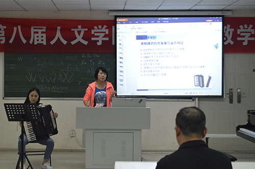 在比赛正式开始前,刘飞云副教授代表全体教职工发表讲话,他在讲话中提到:“我们音乐表演系的教师不只是歌唱家、演奏家,更是教育家,我们需要不断提高我们的教育质量。”14点10分左右,在刘教授讲话结束后,第一位参赛选手王强老师开始了他的教学演示。
