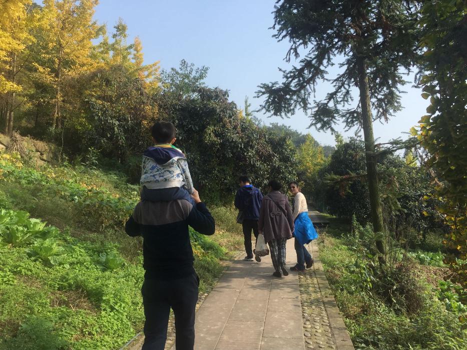 经过一小时多热闹的行程,大家顺利抵达凤栖山。凤栖山位于崇州市境内,山下即著名的街子古镇。天公作美,连日的阴云迷雾在周末一扫而光。冬日暖阳照耀,山里空气清新,趁着游兴正浓,大家决定先登山游览。虽然没有层林尽染的红叶来装点初冬的山林,但沿着山路拾级而上,看银杏飘黄,梨子满树,听狗叫鸡鸣,闻炊烟菜香,更让人体验到一种切实的田园生活感觉。